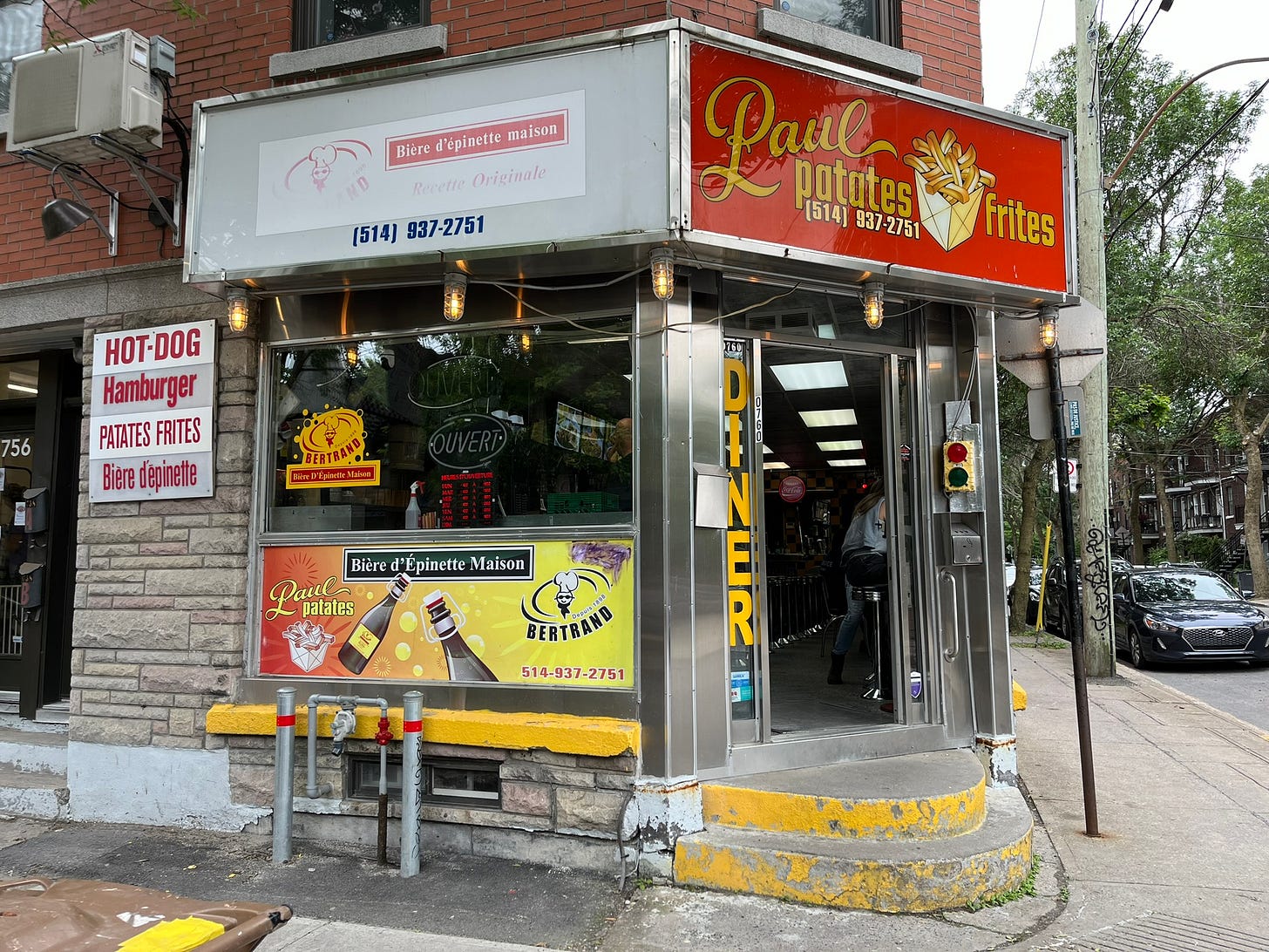 A corner door, angled to face an intersection, opens into the narrow diner Paul Patates, a Montreal institution. It’s a place where customers come to take photos, although it’s a little out of the way in the Pointe-Saint-Charles neighborhood. Three easy-going workers were behind the counter one afternoon. The menu is recalcitrant diner food — hot dogs, fries, poutine, a club sandwich — in large portions set down on paper placemats. Having eaten, I have to say the food isn’t a reason to go. What’s interesting is the house-made bière d’épinette, spruce beer, a kind of soda. It comes in heavy brown glass bottles whose label warns that they should be kept refrigerated at all times. The bubbles inside come from a small alcoholic fermentation. As long as soda contains less than 0.5 percent alcohol, in Quebec it qualifies as non-alcoholic. At Paul Patates, the original version of the spruce beer, called Bertrand, is said to be made according to the 1898 recipe. It’s slightly cloudy and contains water, sugar, yeast, and spruce oil. A newer, sweeter version, called Émile, is less perishable and additionally contains sodium bicarbonate. (I’m not sure why, but it produces bubbles.) When you taste either one, the spruce is so subtle at first that you aren’t sure what the flavor is, and then, as you sip, it builds. The less-sugary original is a good, refreshing drink.